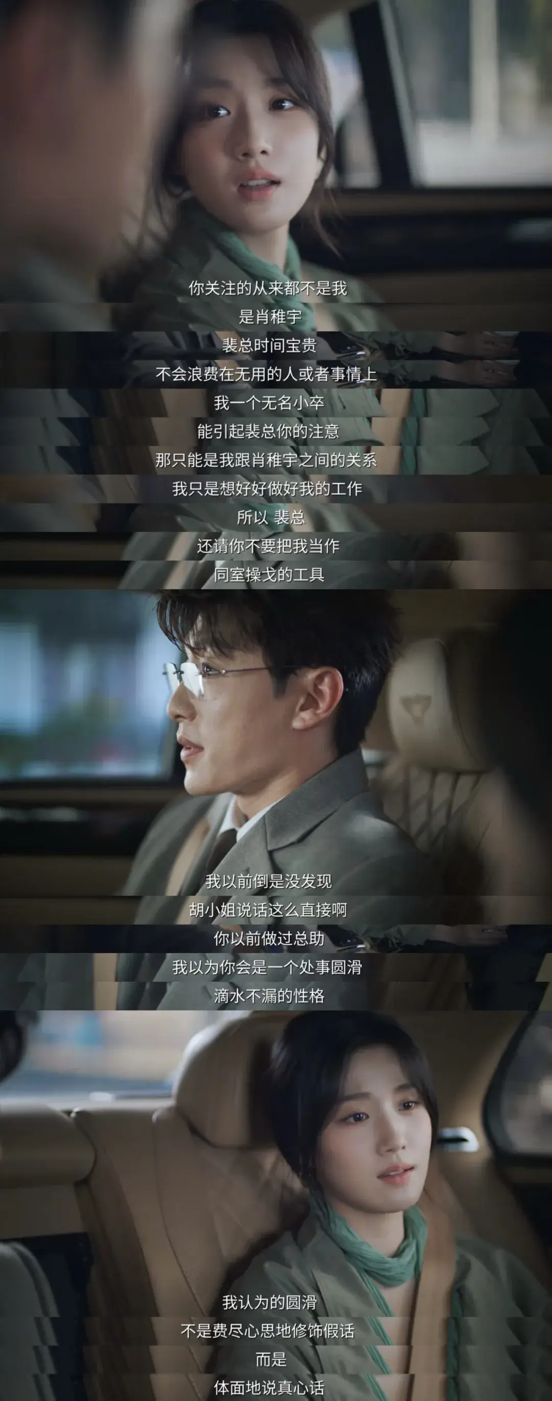 《轧戏》第十六集中,有一场胡羞和裴轸在车上的对谈戏。在这场戏中,胡羞犀利地点出了裴轸把她当成了与肖稚宇竞争的工具,一番剖白既清晰表明了自己的立场,又周全地维持了与裴轸这位工作伙伴的关系。